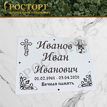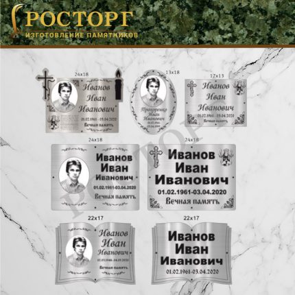 Металлические или каменные таблички с гравировкой имени, дат и памятных надписей. Они могут быть классическими или художественными, с декоративной рамкой, позолотой или рисунками.